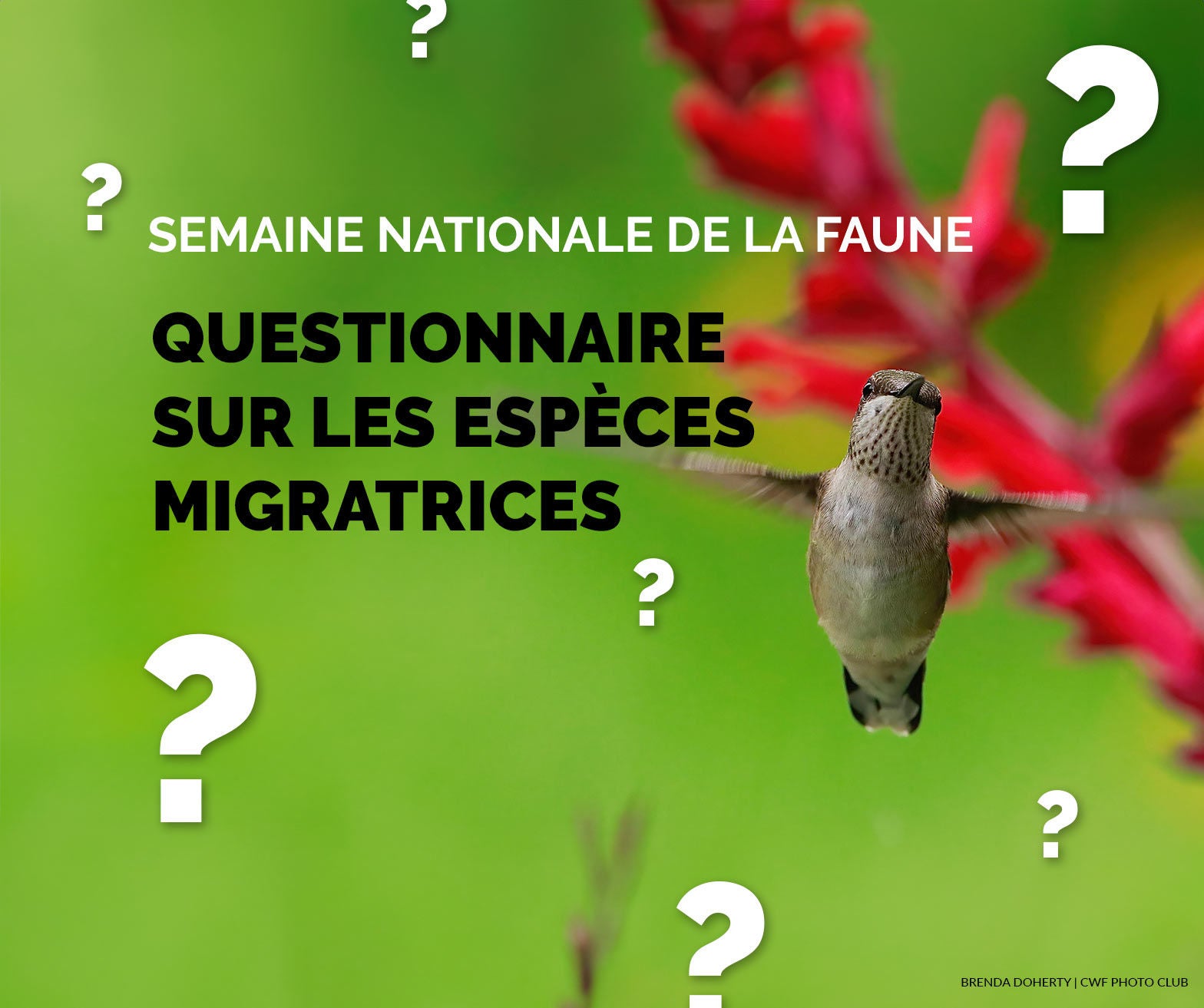 Célébrez avec la Fédération canadienne de la faune tout au long de la Semaine nationale de la conservation de la faune en explorant le monde incroyable de la migration! Découvrez des faits intéressants sur les espèces et les effets du changement climatique sur les voies migratoires et mettez vos connaissances à l'épreuve avec notre amusant jeu-questionnaire sur la migration! Rendons hommage à ces épiques voyages et faisons-en plus ensemble pour la faune!