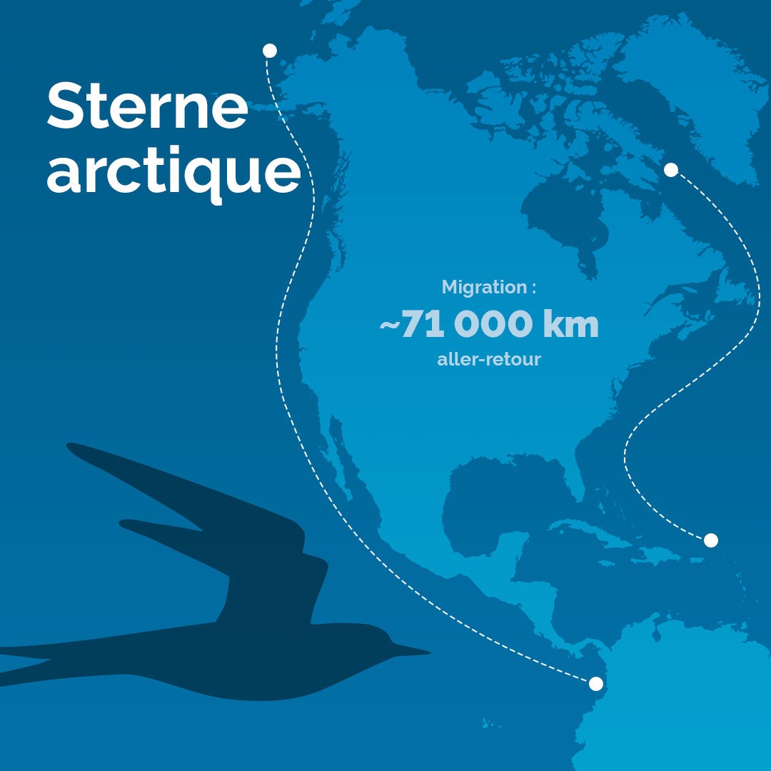 Cet oiseau à tête noire et à bec et pattes rouges effectue une migration impressionnante de 71 000 kilomètres aller-retour. Il se reproduit en été dans l'Arctique et migre jusqu'à l'Antarctique pour y passer l'hiver. C’est ce qui leur vaut le record mondial de la plus longue migration annuelle! Une sterne arctique peut parcourir plus de 2 millions de kilomètres au cours de sa vie.