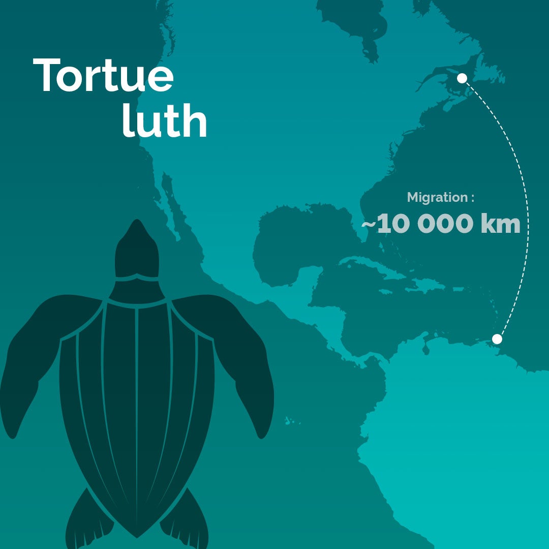 La tortue luth, la plus grande espèce de tortue au monde, migre sur environ 10 000 km entre ses zones d'alimentation et de nidification. Celles de l’Atlantique, qui s’alimentent au large de la côte est du Canada, vont nicher sur les côtes de la Guyane française, du Suriname, de la Grenade, des É.-U. et de la Trinité.