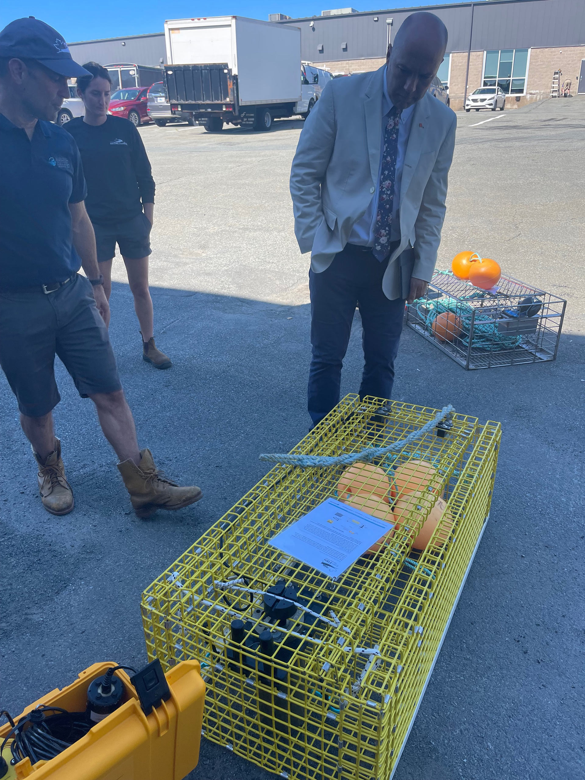 Andy Fillmore, secrétaire parlementaire du ministre de l’Innovation, des Sciences et de l’Industrie et député d’Halifax, examine l’Edgetech 5112, un dispositif conçu pour récupérer des engins de pêche sans l’utilisation de filins à bouée traditionnels. Sean Brilliant, biologiste principal, Programme de conservation des mammifères marins de la FCF, discute des nouveaux systèmes.