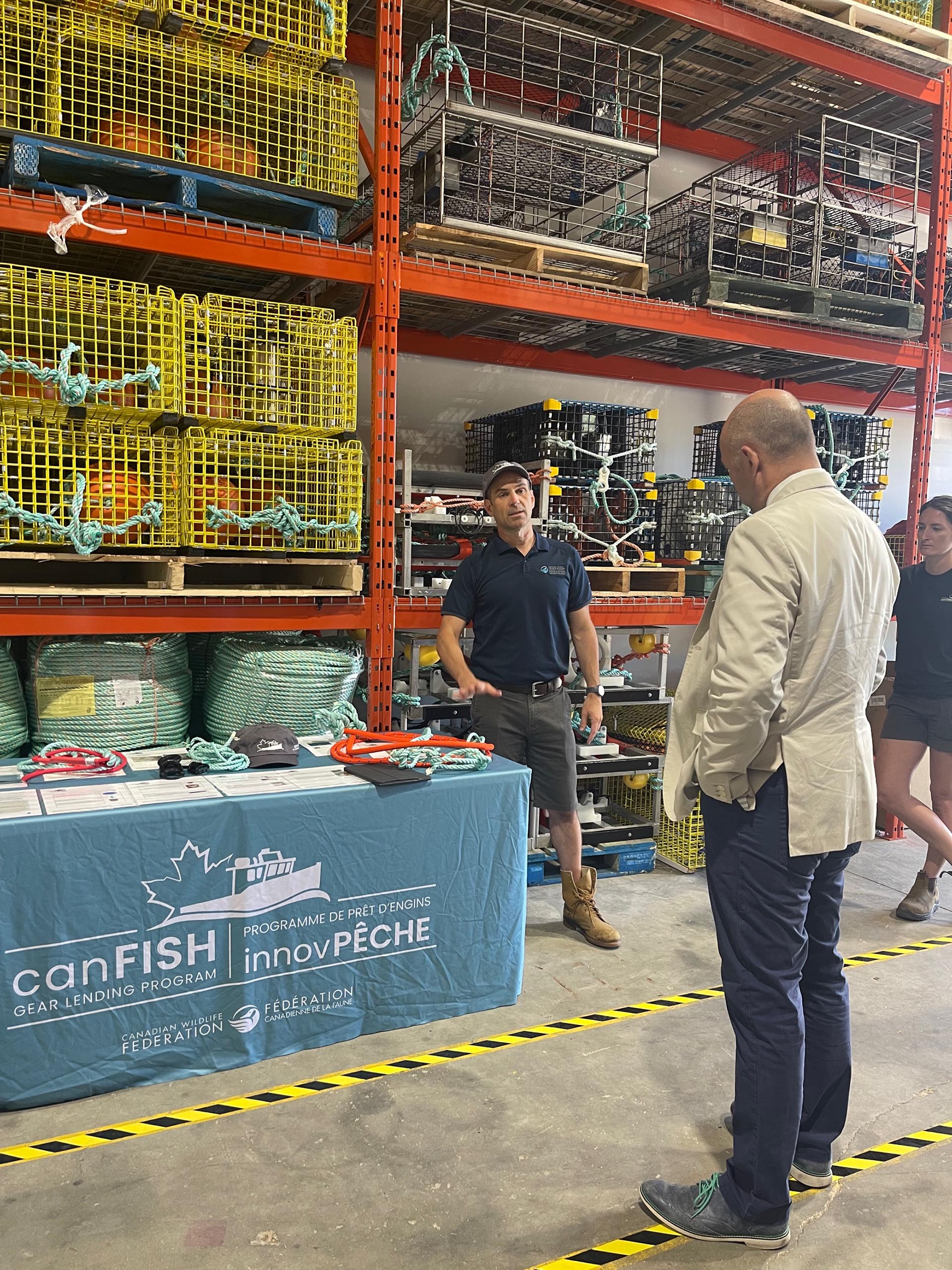 Le nouveau programme innovPêche de la FCF réduit le risque d’empêtrement des grosses baleines en permettant aux pêcheurs d’essayer de nouvelles méthodes de pêche. Dans cette photo, Andy Fillmore, secrétaire parlementaire du ministre de l’Innovation, des Sciences et de l’Industrie et député d’Halifax, visite l’entrepôt des engins de pêche de la FCF. Sean Brilliant, biologiste principal, Programme de conservation des mammifères marins de la FCF, lui montre les nouveaux systèmes.