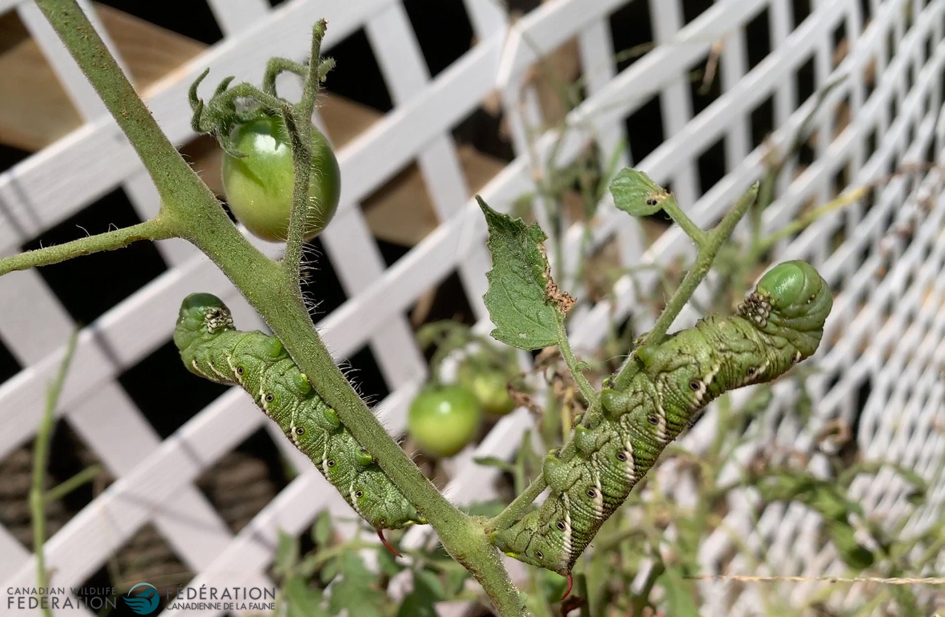 La chenille du sphinx colibri préfère manger les feuilles de nombreuses plantes hôtes comme le chèvrefeuille, la symphorine, l’aubépine, le cerisier, le prunier et bien d’autres! Envisagez de planter quelques-uns de ces arbres pour encourager l’épanouissement de la population de ces chenilles.