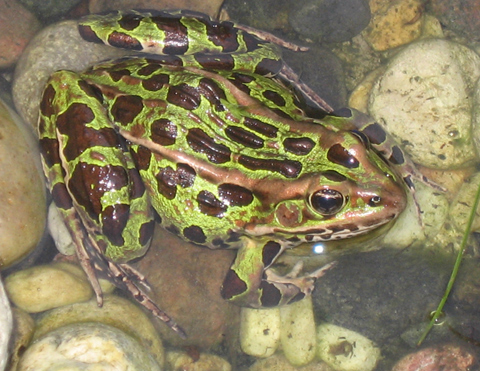 La grenouille léopard tire son nom des taches ovales de couleur foncée qui parsèment le brun et le vert métalliques de sa peau. Ces taches ont souvent un contour jaune plus pâle, et leur nombre varie d’un individu à l’autre. Les grenouilles léopards peuvent mesurer de 50 à 110 millimètres; leurs yeux de couleur orange-or, bien proéminents, ont une pupille noire horizontale.