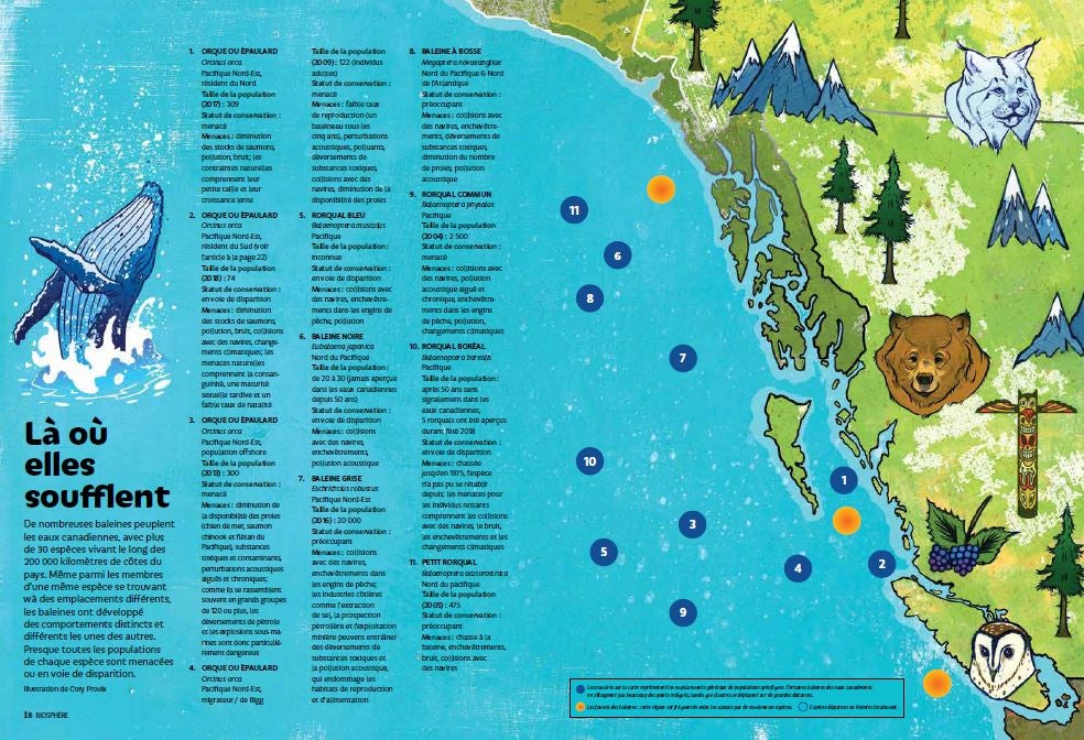 À lui seul, le Canada abrite plus de 30 espèces différentes de baleines et de dauphins, vivant dans sept millions de kilomètres carrés d’océan au large de 243 792 kilomètres de côte, la plus longue de toutes les nations. Les baleines « canadiennes » se trouvent dans les eaux du Pacifique au large de la Colombie-Britannique, de Vancouver au nord jusqu’à l’Alaska, dans l’Atlantique Nord de la Nouvelle-Écosse au cercle polaire arctique et dans les vastes eaux septentrionales de l’archipel arctique du Nunavut et des environs. On retrouve également des baleines dans les principales mers intérieures de la baie d’Hudson, de la baie James, du détroit de Géorgie et du golfe du Saint-Laurent.