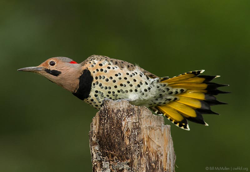 Le pic flamboyant est un pic de taille moyenne qui mesure en moyenne 32 centimètres. Il y a deux types de pics flamboyants, le type doré plus répandu et le type rosé qu’on retrouve principalement dans le sud de la Colombie-Britannique. Les deux sous-espèces ont la poitrine tachetée et une bavette noire sous la gorge, le dos barré de noir d’aile en aile et une tache blanche sur le croupion qui paraît au vol. Le mâle du pic flamboyant doré a la nuque rouge et une bande malaire noire. Sa face est brune. Le dessous des ailes et de la queue est jaune éclatant. Le mâle du type rosé n’a pas la nuque rouge, mais a une bande malaire rouge. Sa face est grise, et la coloration sous les ailes est orangée. La tache noire sur la poitrine est entourée de blanc. La femelle des deux sous-espèces a la même apparence que le mâle, à l’exception de la bande rouge ou noire le long du visage. Dans les régions où les deux sous-espèces sont présentes, elles peuvent parfois s’hybrider, ce qui peut rendre l’identification difficile.