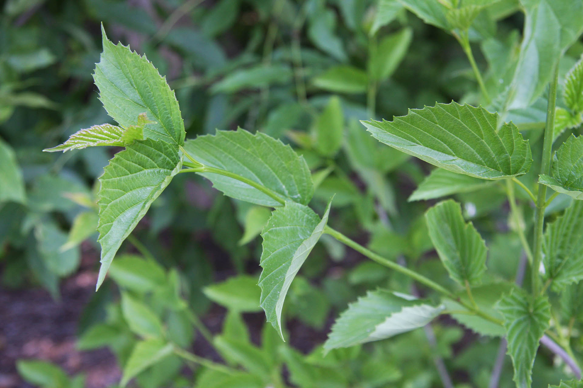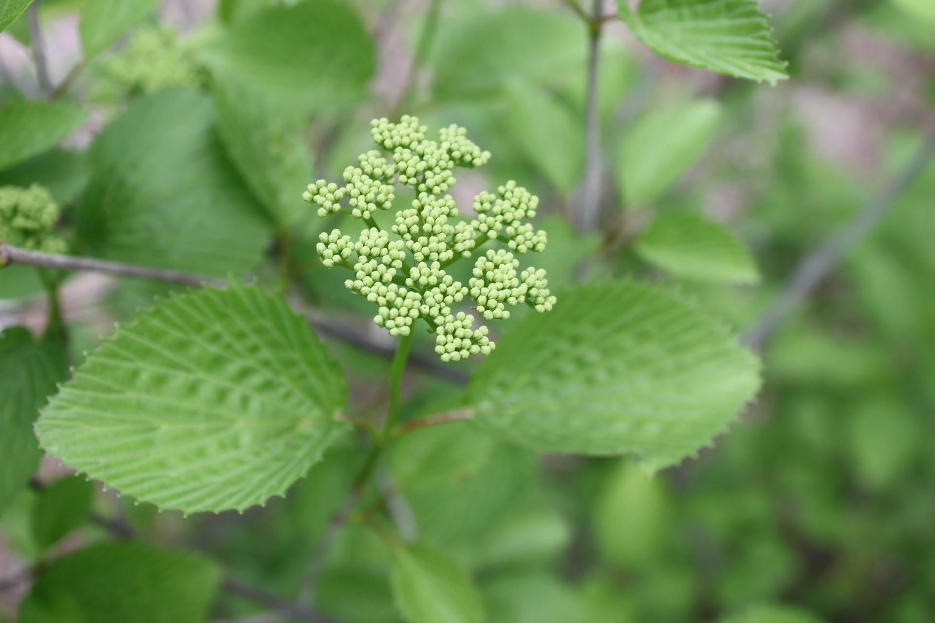 Viburnum dentatum (viorne dentée) : dont les feuilles sont dentées, c’est-à-dire qu’elles ont de la dentelure ou une série de points le long du bord.