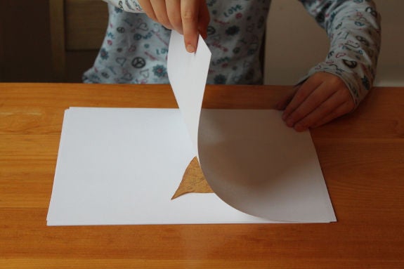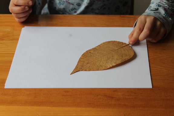 Placez une feuille de végétal sur du papier, sa face supérieure en dessous, contre le papier, de sorte que les nervures faisant saillie sur la face inférieure soient, elles, au-dessus. Cela fera mieux ressortir le motif.