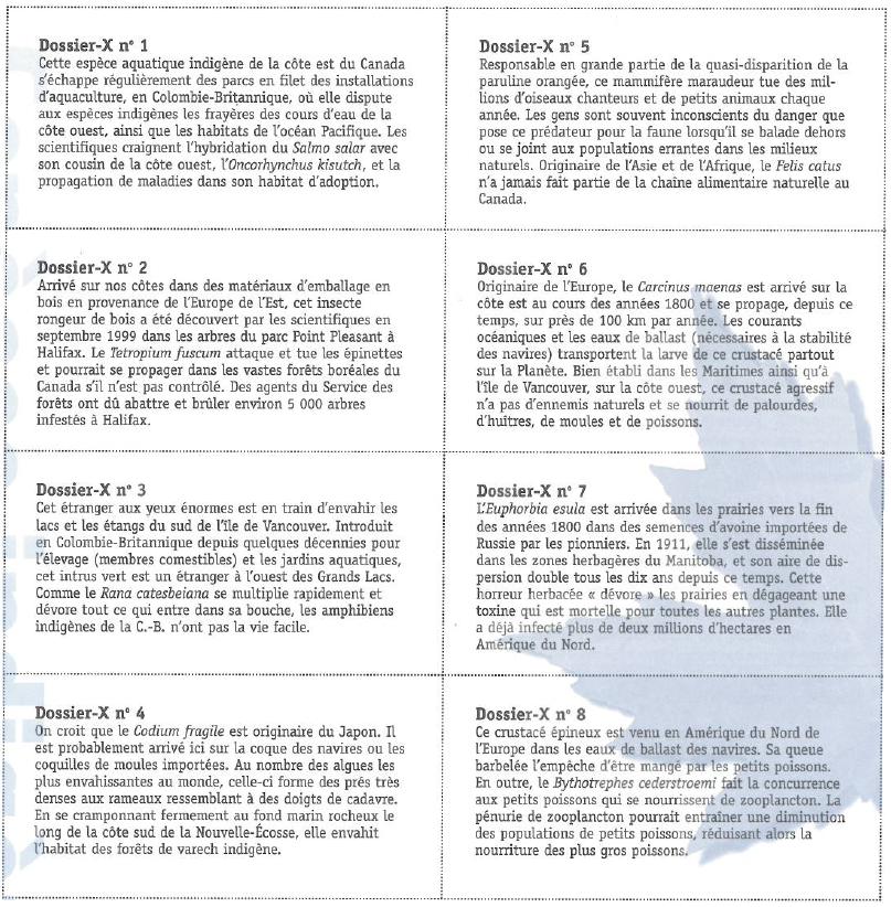 - Ensuite, les élèves font part des résultats de leurs recherches à la classe, en présentant un rapport oral ou écrit. Ou bien, ils dessinent chaque envahisseur et décrivent (brièvement et sans divulguer leur nom) comment les intrus ont été transplantés ici, sur une autre feuille. Transformez ces « dossiers-X » en nouveaux jeux de cartes, faites des photocopies et distribuez les cartes aux petits groupes d'élèves pour répéter l'activité d'appariement décrite plus haut.