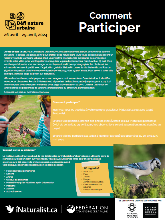 Le 25 avril, de midi à 13 h (EST). Apprenez comment aider votre ville à rivaliser sur la scène mondiale dans le cadre du Défi nature urbaine 2023 : 42 villes du Canada et plus de 400 autres villes du monde entier s’affrontent dans le cadre de ce défi amical pour sauvegarder la biodiversité. Dans le cadre de ce webinaire, James Pagé, de la FCF, expliquera comment contribuer à cet événement mondial annuel en consignant un maximum de plantes et d’animaux à l’aide de la plateforme iNaturalist Canada. Si vous prenez des photos, vous pouvez contribuer à la conservation de la nature : découvrez comment, à l’approche du Défi nature urbaine. Vous n’habitez pas dans une ville participante? Pas de problème, vous pouvez toujours contribuer à iNaturalist depuis n’importe où et à tout moment de l’année! De plus, nous avons besoin de l’aide de tous pour identifier les espèces qui ont été trouvées, même s’il s’agit d’espèces aussi communes que des bernaches du Canada.