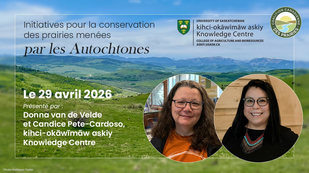 Ce webinaire va mettre en vedette les partenariats que cultive le kihci okāwīmāw askiy Knowledge Centre pour la conservation des prairies. Le Centre travaille avec d’autres organisations aux objectifs semblables pour offrir des points de vue autochtones qui honorent la Terre Mère; il a comme but de veiller à ce que les voix autochtones soient représentées de manière significative et respectueuse dans les efforts de conservation des prairies.